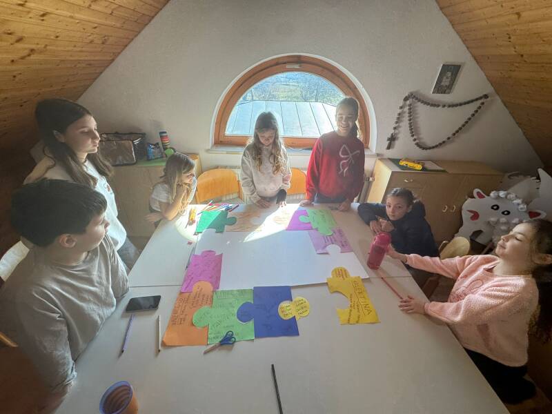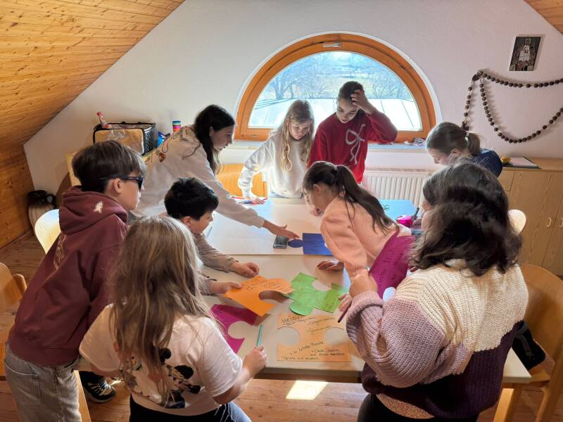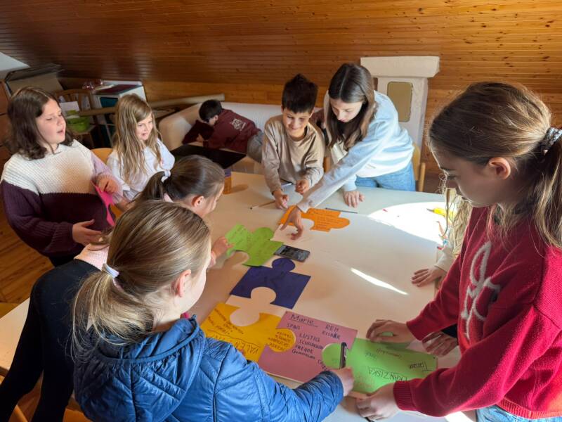In der Februarstunde haben wir uns angesehen, was ein Puzzle mit der Mini-Gemeinschaft gemeinsam hat. Abschließend hatten wir wieder einen guten Abschluss im Pfarrgarten . Ein paar unserer "Teile" fehlten uns - die hab ich zu Hause fertig gestellt und können beim nächsten Mal beschriftet werden.